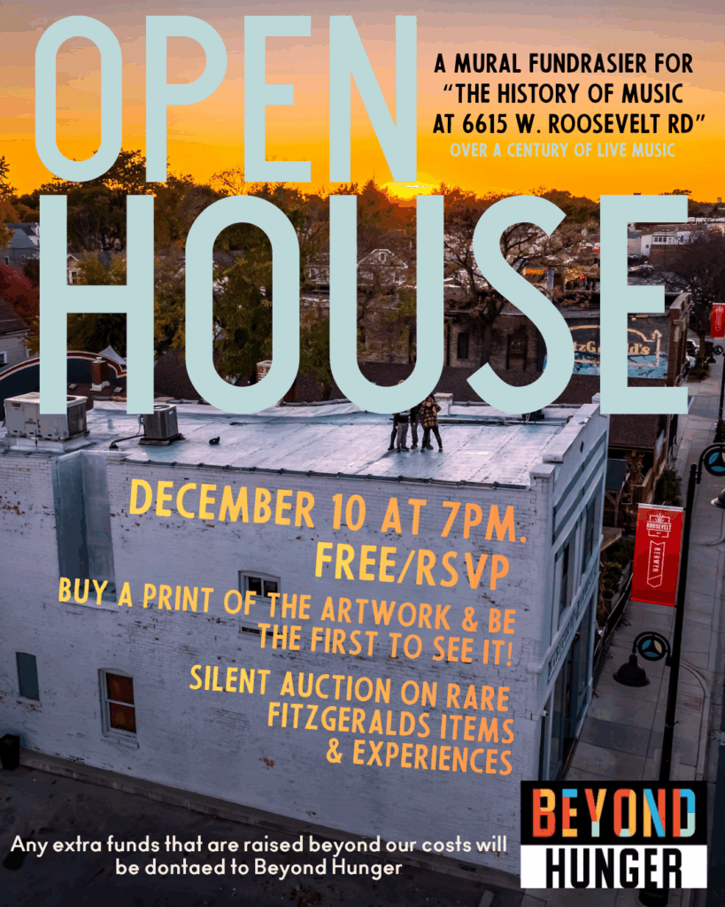 Join us for an evening of History, FREE Live Music, and help us FUNDRAISE for the “History of Music at 6615 W. Roosevelt” Mural! Options for participation include purchasing a print of the artwork that will become the mural by Chicago Music Poster designer (and American Music Festival), Ryan Duggan. Just in time for the holidays! Persons attending this event and purchasing a print will be the first to see the artwork!